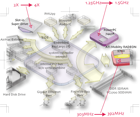 310B_ architecture block diagram of the PowerBook G4 15-inch (Apr 2004)PowerBook G4 15-inchモデルは2004年4月にモデルチェンジを受けている。チップのクロックアップが主体で、大きな変更はない。ATi Mobility Radeonのコアクロックは303MHzから393MHzへ大幅にあがっているが、low-k層間絶縁膜技術の導入によるプロセス技術の向上によるもので、 |