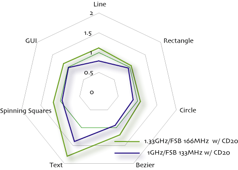 314_ PowerBook G4 12-inch Quartz benchmark test with the External Display1GHzのCPUとGeForce4 440 Goを搭載した初代PowerBook G4 17-inchの本体液晶パネルのみを1としたときの、PowerBook G4 12 inch 1GHzと1.33GHzに20 inch Cinema Displayを接続したXBenchの測定結果を示す。 L2キャッシュの倍増は文字表示など比較的CPUの能力が反映するテストで好成績を残すが、FSBの遅さは逆に単純なLineテストの結果を悪くする。 |